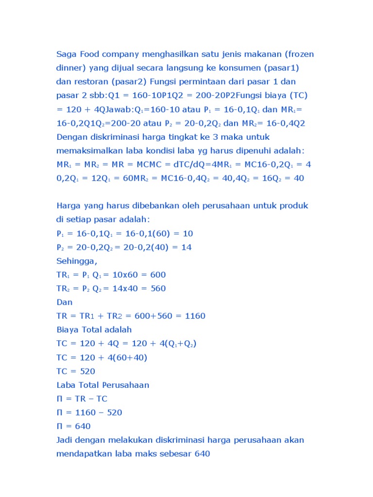 Contoh soal pasar monopoli diskriminasi harga. Contoh soal diskriminasi harga. Produsen mene tapkan harga yang berbeda untuk barang yang sama te tapi.