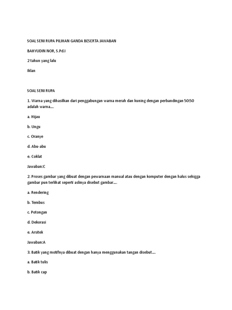Soal Seni Budaya Docx 1 Warna Yang Dihasilkan Dari Penggabungan Warna Merah Dan Kuning Dengan Perbandingan 50 50 Adalah Warna U2026 A Hijau B Ungu C Course Hero