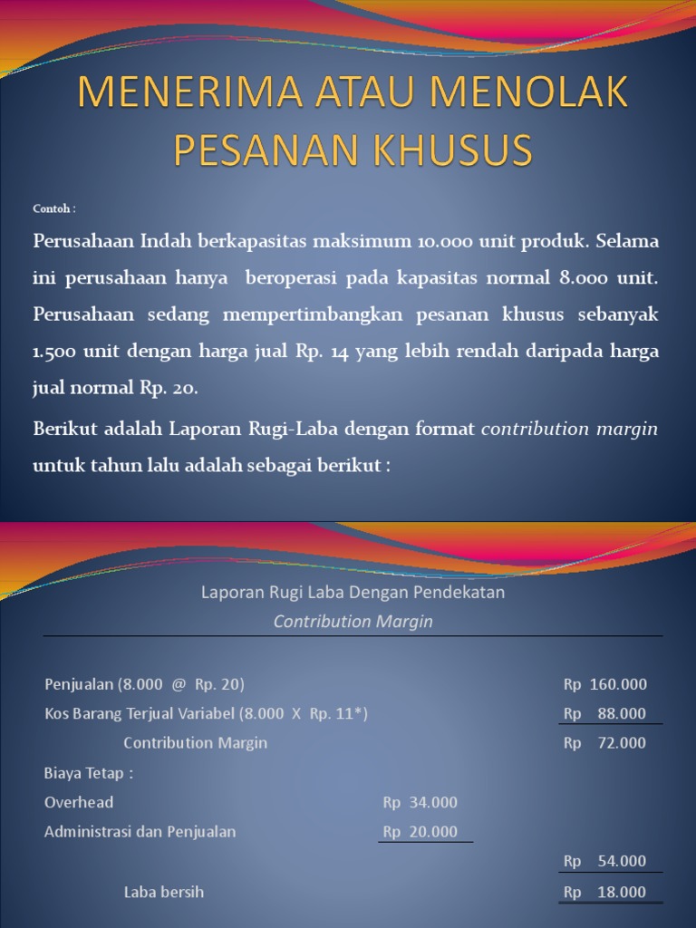 Contoh soal pesanan khusus. Perusahaan menggunakan pendekatan Full Costing dalam penentuan biaya penuh. Scribd es red social de lectura y publicación más importante del mundo. Contoh Soal Pengambilan Keputusan Taktis Akuntansi Manajemen Contoh Soal Terbaru Biaya Relevan Untuk Pembuatan Keputusan Khusus Ppt Download Lecture 8 Pengambilan Keputusan Dalam Kondisi Konflik Game.